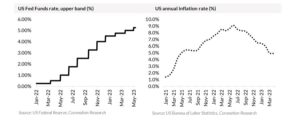 At its last meeting in May, the US Federal Open Market Committee (FOMC) hiked its benchmark rate by further 25bps to an upper limit of 5.25%, in line with market expectations. However, the committee gave a less hawkish commentary than at previous meetings as it highlighted that “in determining the extent to which additional policy firming may be appropriate,” the committee would look at how the economy, inflation, and markets behave over the coming weeks.