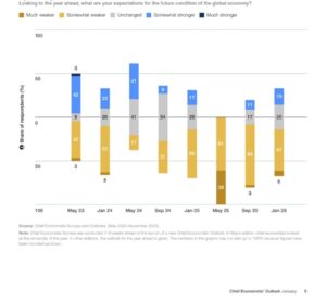 …Acknowledging the relative resilience of the global economy amid turbulence, 53% of chief economists surveyed expect global economic conditions to weaken in the year ahead, down from 72% in September 2025.