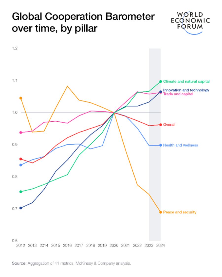 In its third year, the Global Cooperation Barometer 2026, developed in collaboration with McKinsey & Company, uses 41 metrics to assess the level of cooperation worldwide across five pillars: trade and capital; innovation and technology; climate and natural capital; health and wellness; and peace and security.