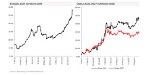 As for Ethiopia, it announced recently a restructuring of foreign debt, including its single Eurobond mentioned above. The yield on this US$1.0bn deal reached 63.5% recently. And, further afield, Zambian debt is also being restructured at this time.