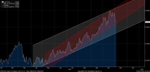 The relative dovish Fed this week has helped the EUR sustain a month-long strengthening trend (red lines). But having seen one trend line of EUR strength fail in mid-2023 (the white lines), we can’t be sure.