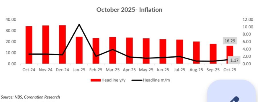 SAT NOV 15 2025-theGBJournal| Ahead of the October inflation print, we anticipate the disinflationary trend to persist, albeit at a slower pace, with headline inflation projected to ease to 16.29% y/y from 18.02% y/y in September, Coronation Research projected in their latest inflation outlook.