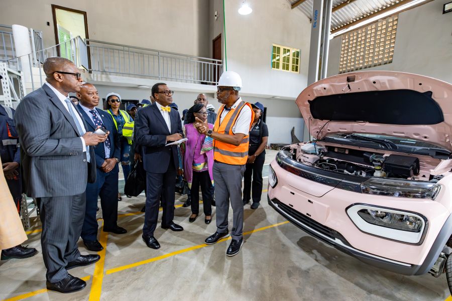 AfDB President Akinwumi Adesina with Saglev EV automobile technicians, during Adesina’s visit to the Saglev assembly plant in Lagos, Nigeria, 31 July 2025