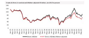If we re-base for US dollar inflation, starting in January 2013, then today’s Brent price is an inflation-adjusted US$65.20/bbl, 24% lower than the nominal price.