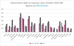 WED, OCT 11 2023-theGBJournal| With rising interest rates making us focus more on debt – it won’t surprise any debt investors that in MSCI EM, the government debt to government revenues ratio is highest in Egypt.