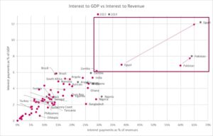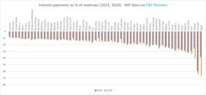 Egypt, which is already enduring a tough 2024 (IMF figures for 2004 refer to fiscal year 2023/24) – with over 60% of revenues being spent on interest, like Pakistan which has already managed for such a ratio for a year.