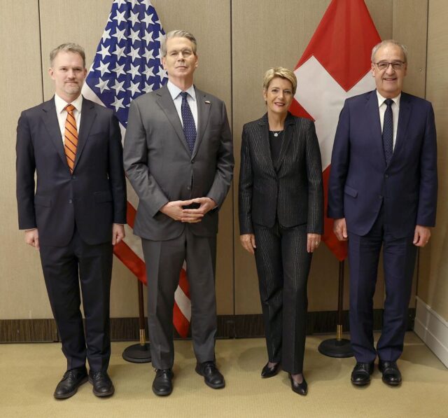 U.S Trade Secretary Jamieson Greer, Treasury Secretary Scott Bessent with President Swiss President Karin Keller-Sutter and Vice President Guy Parmelin of the Swiss Confederation before the accelerated trade talks between U.S and China
